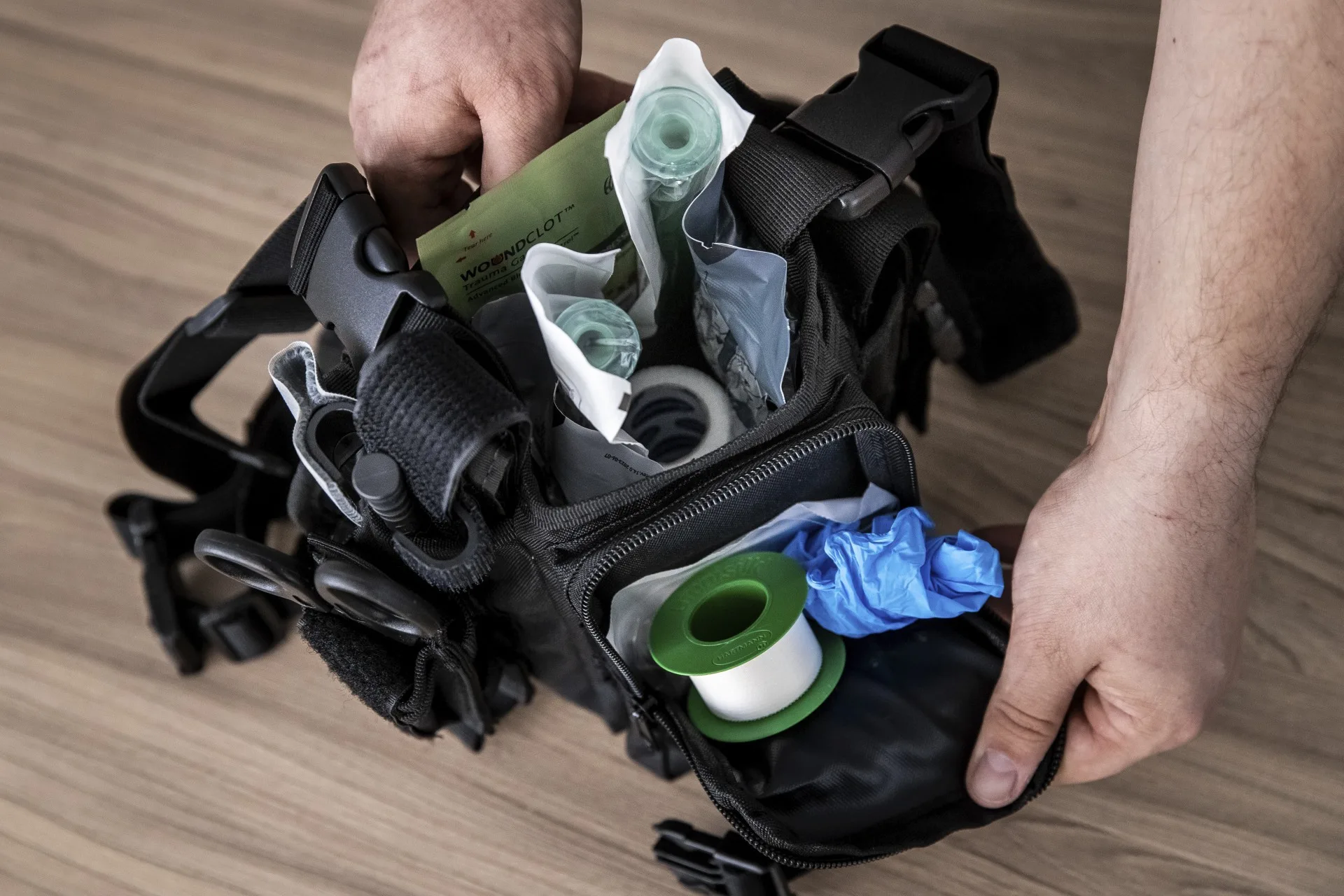 A lista első eleme a „taktikai torniquet”, azaz a CAT-szorítókötés. Ez az eszköz katasztrofális végtagi vérzések elállítására használható érszorító, melynek egyetlen feladata van: a súlyos vérzés elállítása. Ugyanígy a vérzések elállításának feladatköréhez tartozik a speciális, úgynevezett „izraeli” kötszer, melyből 10 és 15 centiméter széles változatok állnak rendelkezésre a táskában. A kötszer fő felhasználási köre a nyomókötések, fedő- és rögzítőkötések köré csoportosul, ám, szükség esetén a speciális kötszer alkalmazható improvizált érszorítóként is. A készlethez tartozó steril kompressziós kötszer kiválóan alkalmas sebek tamponálására, ahogy steril fedőkötésnek is használható. A táskában helyet kapott egy csomag steril mull-lap, amely szükség esetén jól használható sebek környékének megtisztítására, de akár lélegeztetés során, védőmaszkként is.