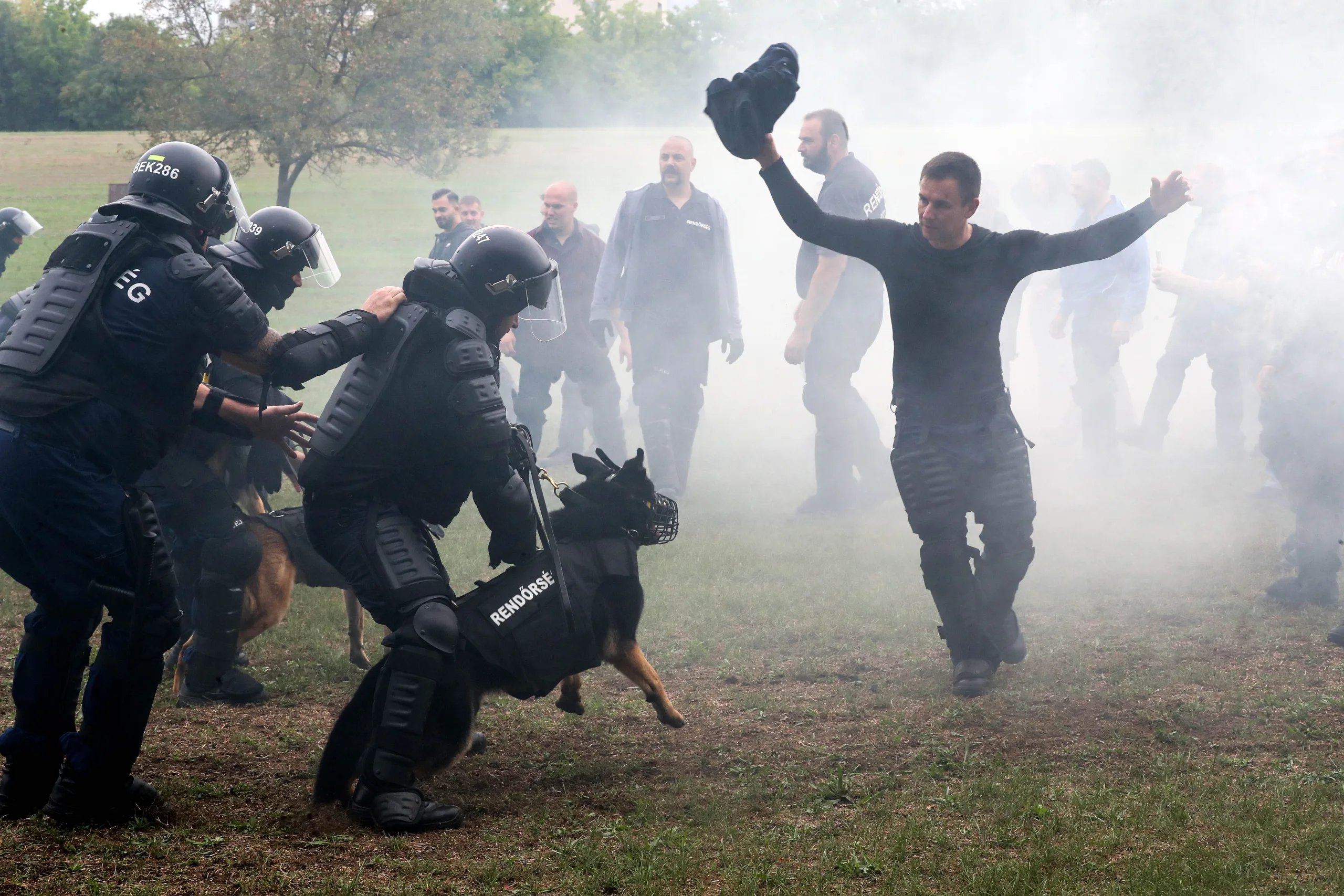 A gyakorlást a rendőrök másnap is folytatták, ekkor a statiszták a hangoskodó tömeget alakították: újfent kiabáltak, lökdösődtek, füstgránátot robbantottak. A rendőrök szisztematikusan szorították vissza őket, miközben a kutyák villámgyorsan csaptak le a „hangadókra”. A füstgránátok és a villódzó fények sem zökkentették ki őket, a négylábú rendőrök higgadtan tették a dolgukat.