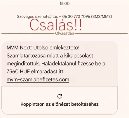 Az elmúlt időszakban megszaporodtak az MVM Next nevével visszaélő, SMS-üzenetek útján elkövetett csalási kísérletek. A módszer megegyezik a korábban tapasztaltakkal: az elkövetők egy állítólagos, lejárt tartozás befizetésére szólítják fel a címzetteket, és a fizetés elmaradása esetére a szolgáltatás kikapcsolását helyezik kilátásba.
