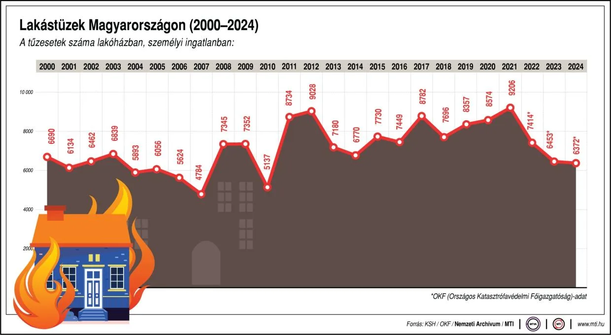 Október elsejéig összesen 4739 lakóépület gyulladt ki, 128 ingatlannal több mint a tavalyi év azonos időszakában. A lakástüzekben 77 ember vesztette életét, az áldozatok száma 19-cel haladja meg az egy évvel ezelőttit; a lakóházakban keletkezett tüzek során 473-an sérültek meg, míg 2024 első kilenc hónapjában 420-an - közölte az Országos Katasztrófavédelmi Főigazgatóság (OKF).