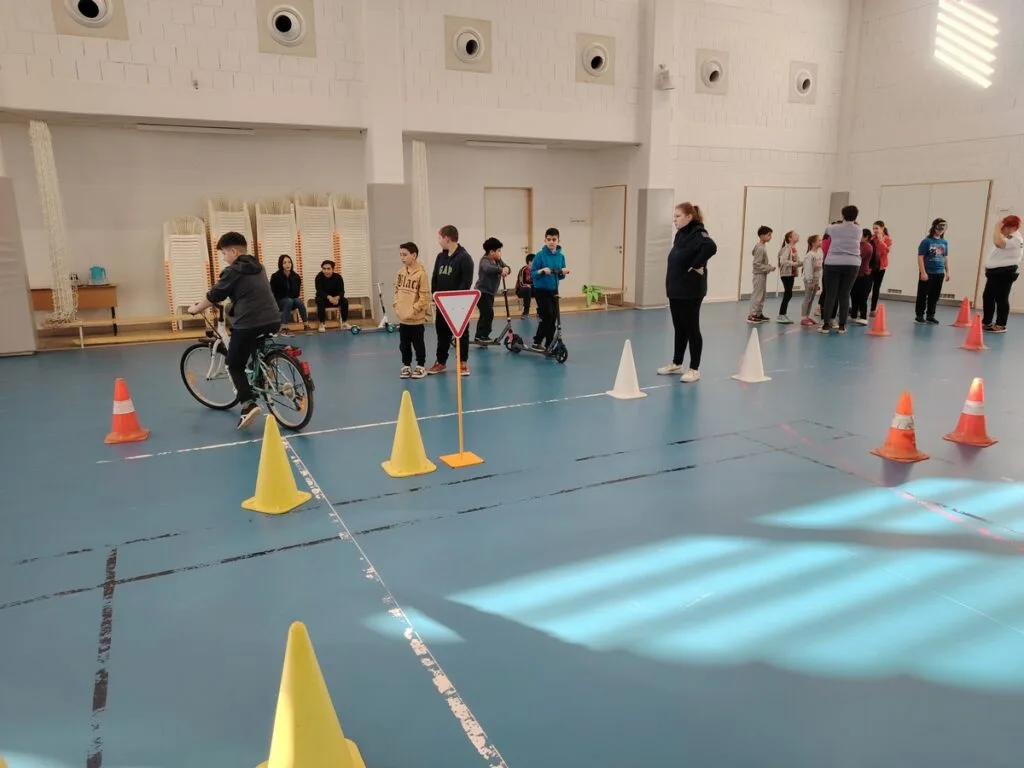 A harmadik helyszínen a mobil KRESZ-park várta az iskolásokat. Itt a gyerekek a kerékpáros közlekedés szabályait, a KRESZ-táblákat, útburkolati jeleket, a közlekedési jelzőlámpák fényjelzésit ismerhették meg és gyakorolhatták a közlekedést.