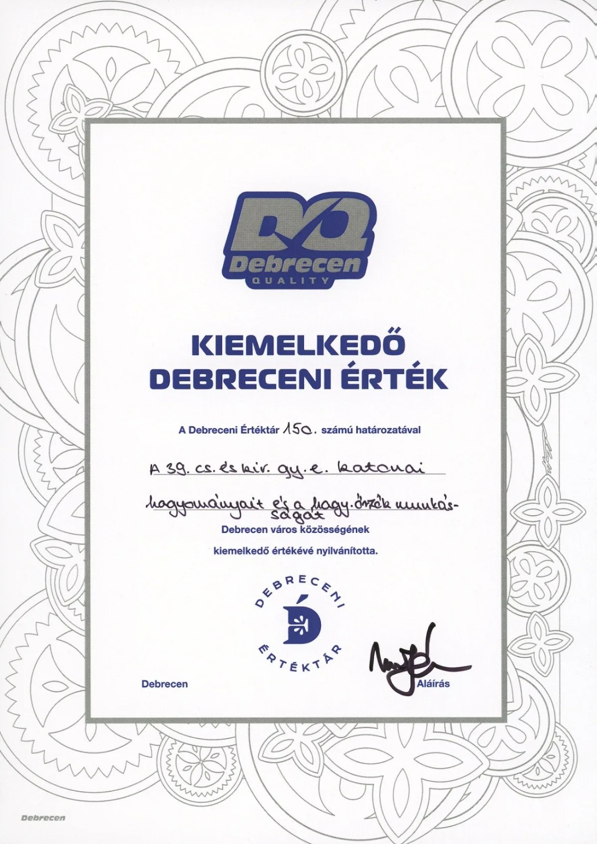 Az esemény egyik kiemelt mozzanataként dr. Mazsu János, a Debreceni Értéktár Bizottság elnöke díszoklevelet adott át Hetényi Botond alezredesnek, a zászlóalj parancsnokának a Kossuth laktanyában. Az elismerés társadalmi megerősítést is jelent: azt üzeni, hogy a katonai hagyományok Debrecen kulturális örökségének szerves részei, és megőrzésük közös felelősség. Hetényi alezredes hangsúlyozta: az alakulat történelmi elődök nyomdokain halad, ami egyszerre megtiszteltetés és komoly felelősség.