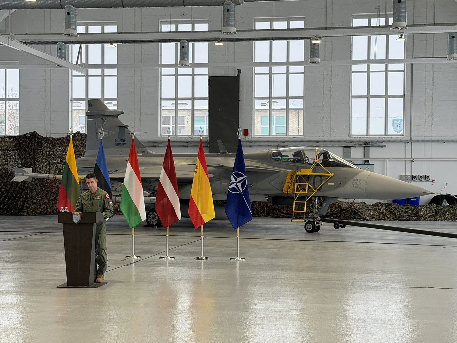 Béres János, Magyarország Litvániába akkreditált nagykövete beszédében hangsúlyozta: a Magyar Honvédség negyedik sikeres szerepvállalása a balti légtérrendészeti feladatban bizonyítja Magyarország NATO iránti elkötelezettségét és szövetségesi szolidaritását. Hozzátette, a balti térség biztonsága úgy a NATO, mint egész Európa közös érdeke.